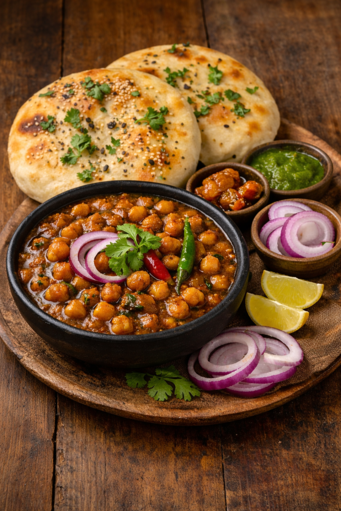 Soft, fluffy kulchas served with a rich and flavorful Punjabi-style chole made from slow-cooked chickpeas in aromatic spices. Accompanied by fresh onions, green chutney, tangy pickle, and lemon wedges for the perfect balance of taste and texture.
